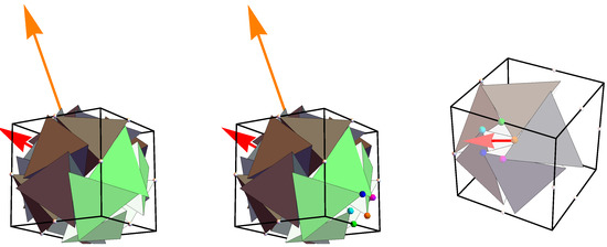 For the construction of the icosahedrally symmetric , we use a family of two successive spinors with with axes of fold and fold rotations (p. 47 in [15]). Here, , as evident by the Schläfli notation for the icosahedron, i.e., . The origin is located at the center of a cubic section of an FCC lattice that hosts tetrahedrons in eight corners in such a way that all eight tetrahedra share a common vertex at this origin. The starting point of our geometric construction using spinors is one of these eight tetrahedra, as will be discussed in the next section. The spinor-axis corresponding to the rotations is given in Dirichlet coordinates as follows: