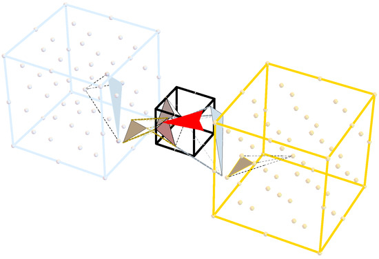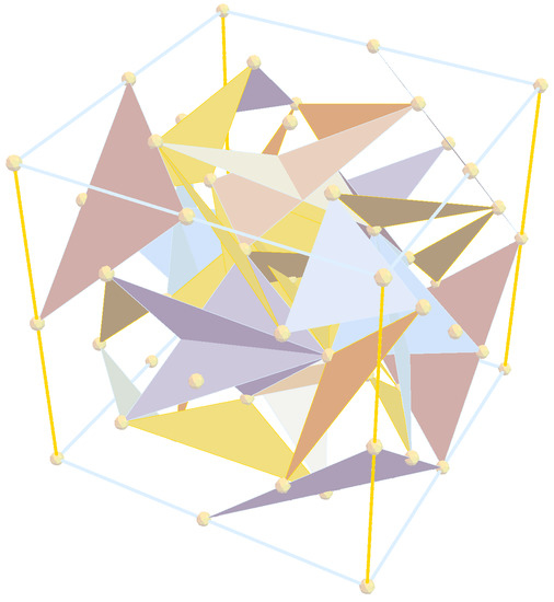 In this section, we demonstrate the action of the spinors and on the vertices of successive tetrahedra starting with a tetrahedron hosted by a cubic section of an FCC lattice, which bears the crystallographic root system, . A cubic section of an FCC lattice hosts eight different tetrahedra in each of its eight corners. These eight tetrahedra belong to two different families of either right- or left-handed chiral groups. However, once we pick one of these tetrahedra as the origin of our construction (see Figure 2 below), the chirality of the ensuing collection of tetrahedra remains invariant under the action of the Clifford spinors.
