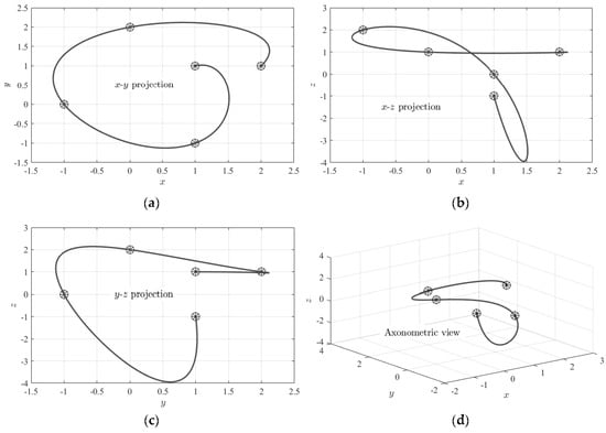Different views of the nonlinear interpolating trajectory obtained using the data given in Table 1. (a): x-y projection, (b): x-z projection, (c): y-z projection, and (d): axonometric view.