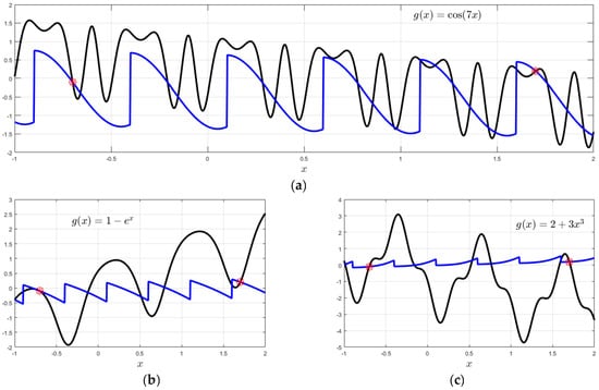 The expressions introduced in Equations (1)–(3) can be used to represent all interpolating functions passing through the point , with the only exception for those satisfying , , and . The proof that Equation (2) provides all functions passing through the point is immediate. Assume represents all functions satisfying , then, by selecting, , we obtain, .