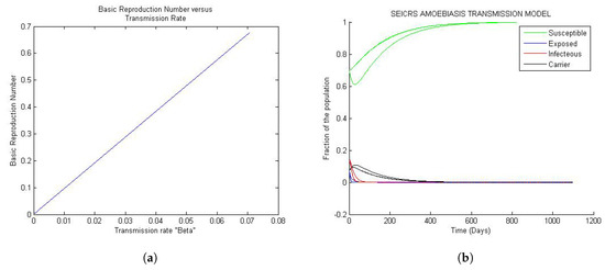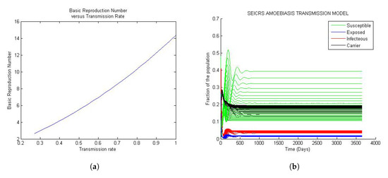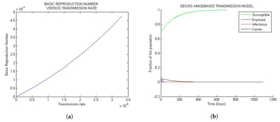The most important aspect in the study of the dynamics of the disease is to quantify the capability of disease transmission through the population. In other words, some conditions described by the threshold parameters have to be fulfilled to invade the population. According to the literature of infectious diseases, the basic reproduction number is the key parameter and it is defined as the number of individuals infected by only one infectious member introduced into the entire population of the susceptible individuals [19,20,21,25,26]. However, in epidemiology modeling, there are other threshold parameters that are too important to be ignored; these are the effective reproduction rate R, the mean age of infection A and the herd immunity threshold . As far as the Amoebiasis’ basic reproduction number is concerned, the onset of Amoebiasis is guaranteed only if one such infectious individual can pass on the disease at an average of at least one susceptible entity. Otherwise, the disease will die out [26]. Indeed, the analytic theory of the dynamics of Amoebiasis is closely associated with the steady states of the dynamics, namely DFE and the endemic equilibrium state.