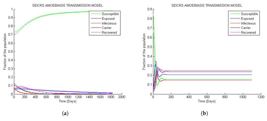 Depending on the values of the parameters,SEICRS epidemic model can be reduced to the SEIRS epidemic model, provided that the acute infectious class, I, and infectious carrier class, C, are combined to give only one class of infectious people, I. The same model may work if the mean time period an individual stays as a carrier of cysts is excessively long (infinite); however, this never happens in the case of Amoebiasis. For this reason, the two infectious states, I and C, have to be considered as two different components of the model. The complete stool analysis exams provide the results based on the presence of cysts (here referred to as the carrier class C) and trophozoites (in reference to the acute infectious class I) separately at some diagnosis centers [22]. This fact supports our assumptions about the distinction between the two classes I and C.
