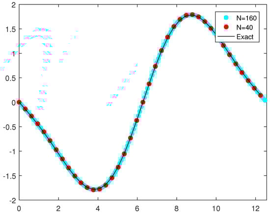 where , and are the orthonormal basis and upper Hessenberg matrix generated by the Arnoldi algorithm with the initial vector ; , and are orthonormal basis and upper Hessenberg matrix generated by the Arnoldi algorithm with the initial vector ; , and are the orthonormal basis and upper Hessenberg matrix generated by the Arnoldi algorithm with the initial vectors , for . We note that , and are orthonormal bases of different Krylov subspaces for the same matrix C, which are generated with different initial vectors in the Arnoldi algorithm. The value of M is taken to be large enough such that the errors of Krylov subspace approximations are much less than the truncation errors of the numerical schemes (Equation (12)). From our numerical experiments in this paper, we can see that our numerical schemes have already given a clear accuracy order with very small sizes , and M does not need to be increased when the spatial–temporal resolution is refined. Specifically, the second-order Krylov IIF scheme has the following form: