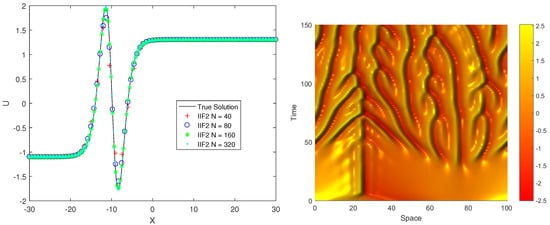 Example 2. Kuramoto–Sivashinsky (KS) equations. Spatial discretizations: the third-order WENO scheme for the advection term; the second-order central schemes for diffusion terms. Left picture: numerical solutions of Equation (29) using the IIF2 scheme with ; final time: ; CFL number for the hyperbolic term: . Right picture: time evolution for Equation (32) solved using the Krylov IIF2 scheme with ; ; CFL number for the hyperbolic term: ; time runs from at the bottom of the picture to 150 at the top.