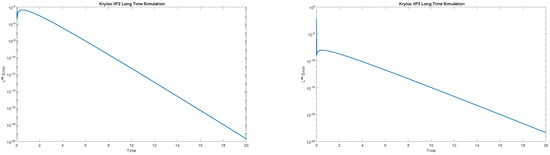 As is pointed out in [], in the implementation of the methods, we do not store matrices C, because only multiplications of matrices C with vectors are needed in the methods, and they correspond to certain finite difference operations. In the Krylov IIF schemes (Equations (19)–(21)) for fourth-order PDEs, the “local implicit” property of the original IIF schemes in [] is preserved well; namely, the implicit terms are free of the exponential operation. As a result, the implicit nonlinear system is decoupled for each spatial grid point. The size of the implicit nonlinear system at every spatial grid point only depends on the number of original PDEs. This “local implicit” property provides a key factor for the efficiency of our high-order Krylov IIF schemes. The small-size implicit nonlinear system can be either solved analytically or efficiently solved numerically by a fixed-point iteration method [] or a Newton iteration method [].