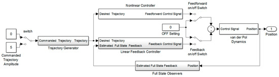 The methodology begins with elaboration of the inherent dynamics and impact of various initial conditions. Equation (1) is simulated in SIMULINK (Figure 1), where the nonlinear van der Pol equation is forward-propagated in time with various initial conditions. Figure 1 is the overall control topology coded in MATLAB/SIMULINK software (R2015b, Mathworks, 640 W California Ave, Sunnyvale, CA USA): Desired-trajectory (left) is fed to controllers (center) that formulate the forcing functions to drive the van der Pol dynamics (right). State observers are used to augment linear feedback controllers (but are not necessary for nonlinear feedforward controllers). Manual switches allow for “apples-to-apples” comparisons where all other features are kept constant except for the manually switched feature [5]. Results are plotted together on single plots to highlight relative behaviors. Then, controllers are designed and implemented in the same SIMULINK model. The dynamics after incorporation of the disparate controller varies. In the first instance to be examined, the dynamic remains open loop while using only an ideal nonlinear controller, while the second and third iterations include a linear, optimal feedback controller, and thus the system dynamics are closed-loop dynamics.