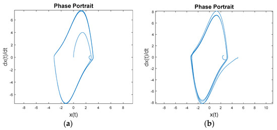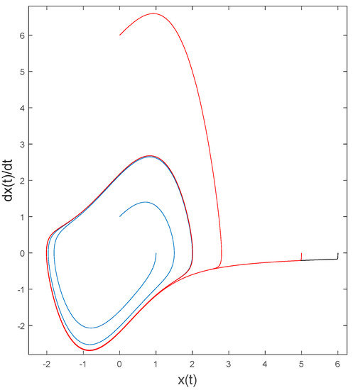 The normal first procedure for control design involves linearizing the dynamic equation, and afterwards designing the control signal using the linearized dynamics. Linearizing Equation (1) leads to Equation (5), expressed in state-variable formulation from which state space trajectories are displayed on phase portraits (e.g., Figure 2, Figure 3, Figure 4 and Figure 5).