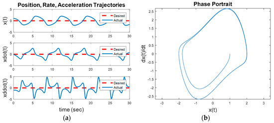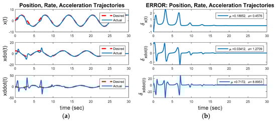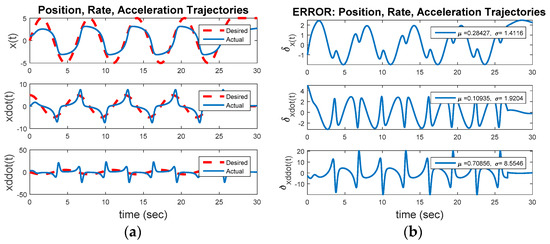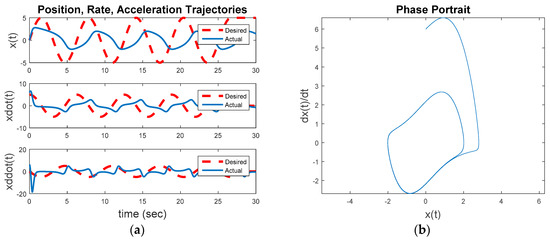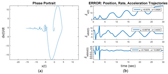 Figure 7 reveals the third step away from the initial baseline for evaluation: Commanding a desired trajectory as a circle of radius five using idealized feedforward control. From a non-zero initial condition, the inherent dynamics will seek to converge to a non-circular invariant set while the feedforward controller seek to force the trajectory into a circle of radius equal to five. This instance uses Figure 1 with a commanded circular trajectory, and the control switch is activated for the feedforward controller. Figure 7 reveals the idealized nonlinear feedforward controller designed per the methodology inspired by [7], implemented in [12] for Euler’s moment equations and augmented in [10,13], and demonstrated in [8,9]. The results of these steady improvements applied to the van der Pol equation results in Equation (4) which (after three-to-four overshoot events) achieves a circular oscillatory trajectory with the commanded amplitude. The result is obviously vastly superior to the results achieved with the optimal LTI feedback controller. Figure 8a displays the baseline comparison of desired trajectory versus actual trajectory (again revealing the overshoots followed by close trajectory following), Figure 8b displays the position, rate, and acceleration errors. Clearly visible in figure a, after the initial transient the idealized, nonlinear feedforward controller exactly achieves the commanded oscillatory trajectory, with very close command-following achieved after a short (10 s or so) startup transient.