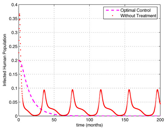 In Figure 1, it is clear that without control, the fraction of infected humans decreases to low levels, then starts to increase and repeats this process periodically; however with optimal control, it decreases to a very low level and settles at that level.