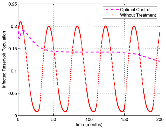 Figure 2 shows that the fraction of infected reservoirs without control increases at first, then decreases to a very low level, before increasing again; this process is repeated, and the fraction of infected reservoirs with control increases at first, then decreases again and settles on a medium level. This is because there is no control applied to the reservoir population.