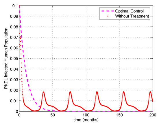 In Figure 4, we show that without control, the fraction of PKDL-infected humans decreases at first, then increases; this process repeats again until the end of the simulation time, while with control, this fraction decreases to a very low level.