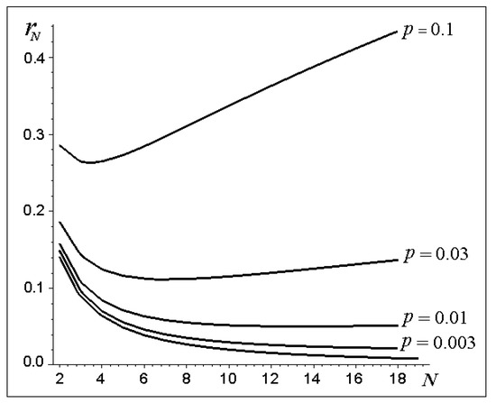 Figure 3 presents the graphs of the total error . If the permissible error of the device is = 0.01, then, as follows from the figure, the minimum of the total error as a function of the number of elements is reached approximately at = 12. The minimum is thus flat, and this means that when decreasing the number of elements, the error will change insignificantly. Hence it follows that for almost the same accuracy of approximation it is economically more advantageous to use 6–8 elements to construct the FDF.