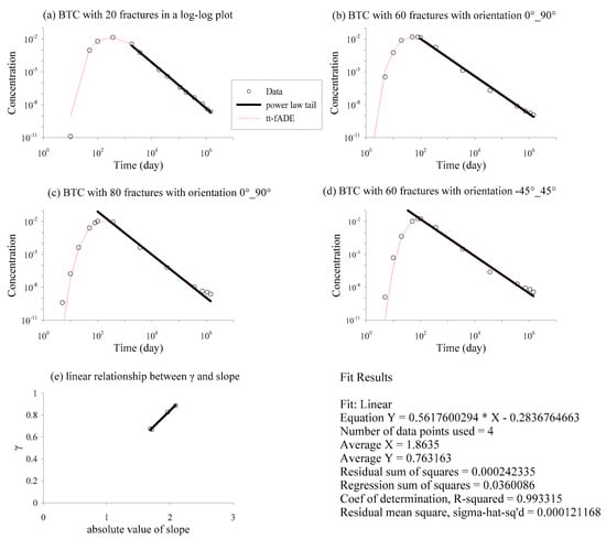 Breakthrough curves (BTCs) at the control plane x = 50 m for three different fracture densities (a–c); (b,d) have the same fracture density with different orientations. The BTC data (i.e., symbols) are simulated by HGS. The red line is the solution of the tempered time fADE (tt-fADE) model (10) and (11). The black line is a power law approximation to the late time decay in concentration. (e) shows the empirical linear relationship between the slope of the power-law decay in concentration and the time index γ in the tt-fADE model (10) and (11).