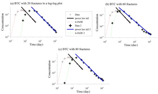 BTCs at the control plane x = 50 m for three different fracture densities (a–c) with matrix permeability of 1.1 × 10−13 m2 (red lines and circles) and 5.5 × 10−15 m2 (green lines and crosses). The BTC data (i.e., symbols) are simulated by HGS. The red/green line is the solution of the tt-fADE model (10) and (11). The black/blue line is a power-law approximation to the late time decay in concentration.