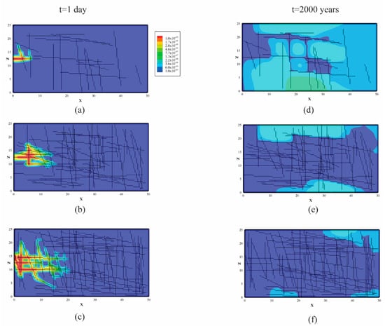 One realization of plume snapshots for the first time step (t = 1 day) for the three different fracture densities: (a) the DFNs with 20 fractures; (b) 60 fractures; and (c) 80 fractures. The 13th time step (t = 2000 years) for the three different fracture densities: (d) 20 fractures; (e) 60 fractures; and (f) 80 fractures.