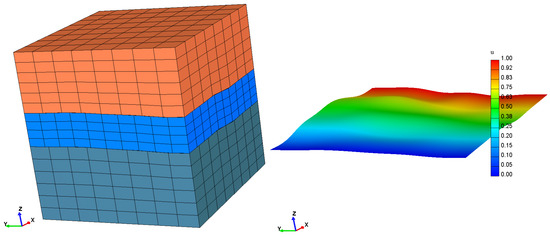 Figure 8 shows the three subdomains whose meshes are hexahedral. Table 1 summarizes the metrics of these meshes. A NURBS interpolation surface represents the mortar geometry, whose finite element space corresponds to a tensor-product grid of (20 × 20) linear piecewise rectangular elements. We employed a frontal-direct solver to determine the global SPP (21) [1]. The results that Figure 9 depicts have good accordance with the assumed pressure field. The error is 5.68 × 10 in the pay-zone level for instance.