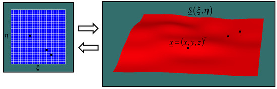 in Equation (19) is the mortar space while and are the weighting and Lagrange multiplier spaces, respectively. Let be a two-parameter mapping that describes a given mortar geometry, i.e., NURBS surface, where the parameters , correspond to orthogonal directions related with the surface in the reference or computational plane, , a rectangle whose image becomes the surface in 3-D. Let be a conforming triangulation of the reference plane, , whose mapping or image depicts the mortar as a discrete geometrical object, e.g., a quadrilateral surface. We also take the mortar space as a finite-dimensional subset of the continuous set of Sobolev spaces: