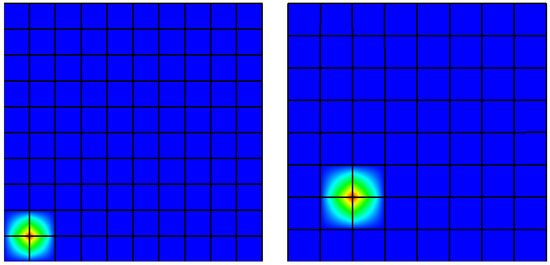 Finally, Figure 6 depicts the mortar projector as a matrix, for the problem described in Figure 5, its dimensions are (11 × 11) × (9 × 9). It is indeed, in this case, a symmetric matrix. The highest values correspond to those entries where the mortar and non-mortar points are at their closest locations. The mortar projector resembles a projector which permits mapping onto the mortar space by using the matrix . Also, mapping to a non-mortar side relies on another method that we particularly described in [1].