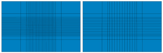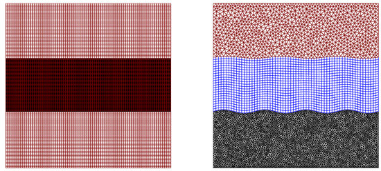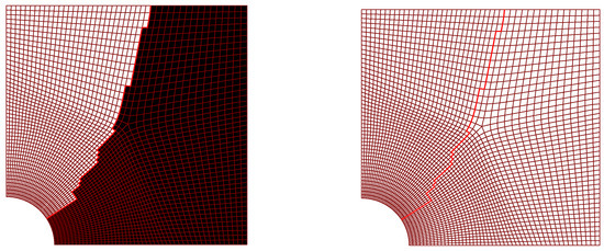 We denote the primary variable “displacements” while “tractions” correspond to their orthogonal derivative in the border. We calculate the former on the boundary after determining the first step on the white subdomains. We then transfer them to complete the second step on the Neumann subdomains. On them, since we know the tractions, we thus determine the displacements to update them for the next iteration. We relax both quantities to improve the convergence where the loosening parameters and belong to I = as shown in Equation (24):