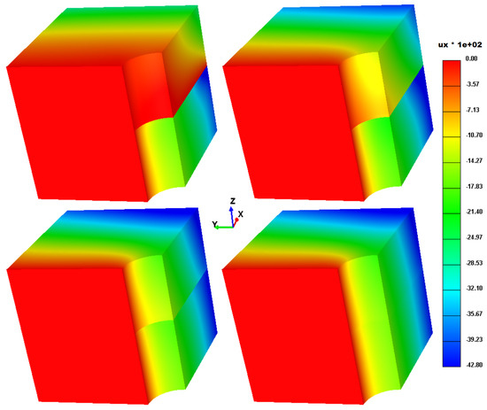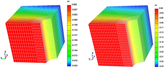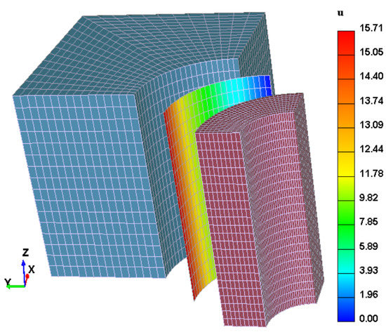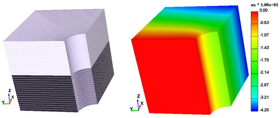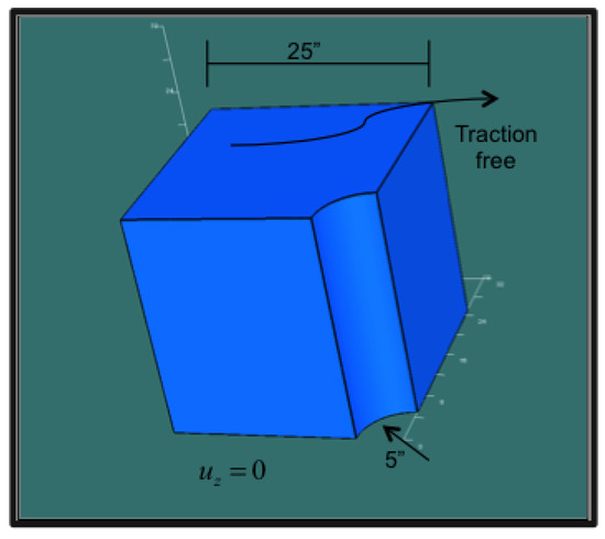 We revisit herein the well-known Bradley’s problem that we discussed already in [1] (see Figure 16). We consider homogeneous linear isotropic elasticity. Figure 16 depicts the problem geometry and BCS for a 2-D case where we prescribed pressure in the borehole, symmetrical displacements becomes zero on the bottom and left surfaces while we enforce the in situ or remote stresses in the remaining surfaces, as depicted in the figure. The hole’s radius is 5.0 inches, and the square length is 25.0 inches. Table 4 below shows the mechanical properties, pressure unit is MPa, and values for BCS where we divide the parameters by the mean remote stress, i.e., , to normalize them. We extend Bradley’s problem to 3-D as proceeds. The geometrical entity encompasses a cube at the origin with a side of 25.0 inches, and we subtract an aligned cylinder whose radius is 5.0 inches as pictured in Figure 17. Additionally to the 2-D conditions above, we axially enforce, i.e., z-direction, no displacement in the bottom face while the top surface is traction-free, as displayed in the figure.