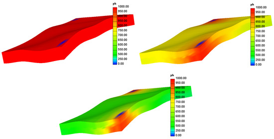 We consider two vertical producer wells in the corners, with prescribed bottom hole pressure, as depicted in Figure 30. The initial condition comprises a uniform pressure of 1000.0 Psi in the entire pay-zone while we assume p in the wells as 0.0 Psi that resembles a depletion situation. We also consider no-flow BCS on all reservoir surfaces. The initial displacement field is zero as well. Figure 30 depicts, in reading order, pressure evolution snapshots after 0, 20, and 40 years of production. We analyze these last two snapshots for MFEM purposes.
