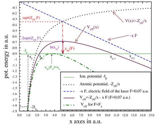 compare Figure 1. In this model, the tunneling process can be described solely by the ionization potential of the valence (the interacting) electron and the peak field strength F, which leads to the quantity , where F stands (throughout this work) for the peak electric field strength at maximum. In Figure 1 (for details, see [3]), the inner (entrance ) and outer (exit ) point , the barrier width and the barrier height is . The barrier disappear for () at the atomic field strength , where the direct ionization starts, the barrier-suppression ionization.