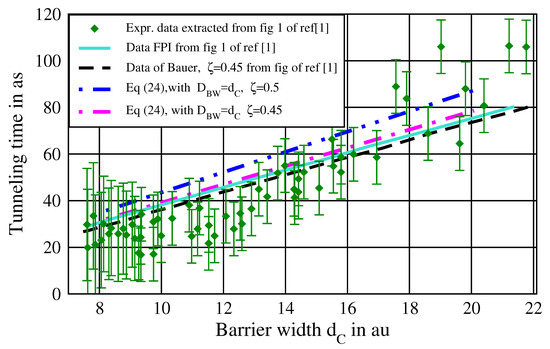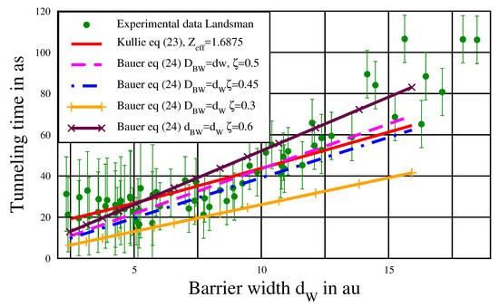 In Figure 2, we plot our result of tunneling time , Equation (23), against the barrier width , where is used, together with Bauer’s tunneling time formula , Equation (24), with used by Bauer, with our value and the values used by Bauer. In addition, the experimental tunneling time data (plotted against ) together with the error bars are shown. The elementary data or the experimental values of time of [6] (at the corresponding F values) were sent by Landsman, where was easily calculated from . As seen in Figure 2, Equation (23) (solid red line) shows the best fit with the experimental data. The dashed (pink) line of Equation (24) with and is slightly below the red solid line (for small ), and the dashed dotted (blue) one of Equation (23) with and is slightly below both.