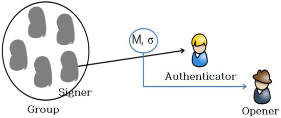 32. Bellare, M.; Micciancio, D.; Warinschi, B. Foundations of Group Signatures: Formal Definitions, Simplified Requirements, and a Construction Based on General Assumptions. In Proceedings of the International Conference on the Theory and Applications of Cryptographic Techniques (EUROCRYPT), Warsaw, Poland, 4–8 May 2003; Springer: Berlin/Heidelberg, Germany, 2003; pp. 614–629. [Google Scholar]