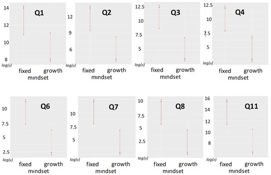 As shown in Figure 6, individual elements of Q are in the main larger in the fixed mindset condition and in the growth mindset condition, suggesting that, as expected, trajectories observed in participants in the fixed mindset condition were more heterogamous in their motion patterns.