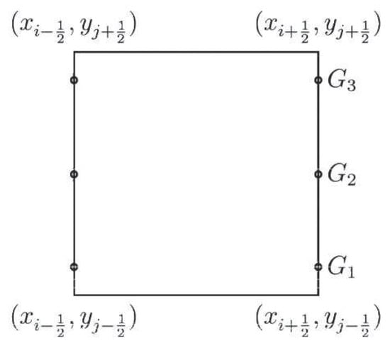 three point Gaussian quadrature formulae are used for the above line integration. The integrand, that is numerical flux vector and , at every Gaussian point , , is obtained by the regular fifth order WENO finite volume reconstruction and the Lax–Friedrich numerical flux, as described in Section 2.2, where are the three Gaussian points. Meanwhile, the reconstruction of , and , in the second and third term (Equation (21)) on Gaussian points of cell interface are calculated in this procession of WENO reconstruction. That is, in this procession, we calculate , , , in subroutine of WENO reconstruction. Notice that the extra factor multiplying by in Equation (21) leads to a one order lower flux approximation than that of the first time derivative . In x-direction, the linear polynomial and constant are the approximations to and . According to polynomial (Equation (9)), on small stencil, we have