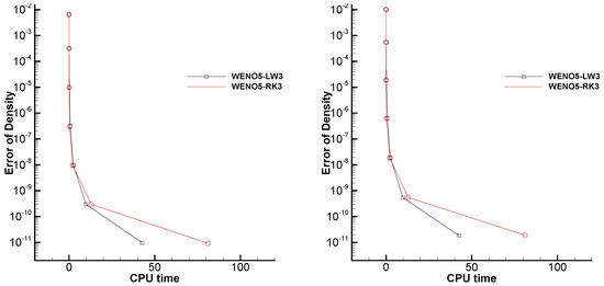 In Figure 2, we give the numerical errors and CPU time cost for density based on and norm metric with cell numbers are , and Log scale is used for numerical errors in y axis. In this figure, the line of WENO5-LW3 always underneath the line of WENO5-RK3, which implies that, with the same CPU time cost, WENO5-LW3 obtains a higher accuracy than WENO5-RK3. From the trend of the line, it seems that the phenomenon will be more serious when the test has more mesh points.