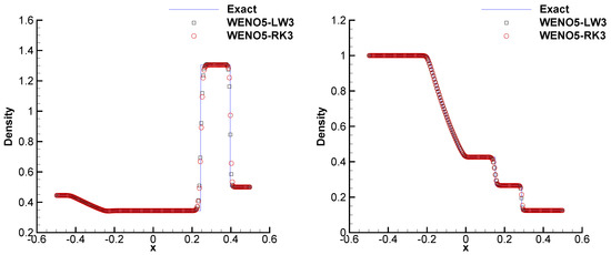 The numerical errors and orders of accuracy based on and norm metric for density by WENO5-LW3 are shown in Table 1. N stands for the number of mesh grids; adjusted adaptive time step size should be used to get the fifth order as mesh refining. For comparison, the and numerical errors and accuracy orders by WENO5-RK3 schemes are displayed in Table 1. In Table 1, we can find that the designed accuracy order are attained for both WENO5-LW3 and WENO5-RK3, and they generate similar numerical errors.