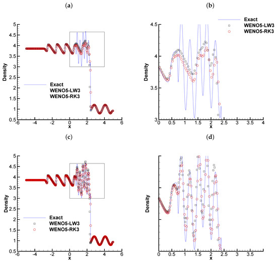 The shock density wave interaction problem at by WENO5-LW3 and WENO5-RK3 with and . (a) N = 200 for density; (b) N = 200 density zoomed in; (c) N = 400 for density; (d) N = 400 density zoomed in.