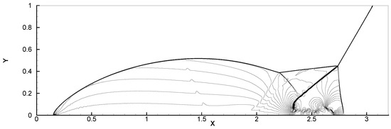 This problem is a two-dimensional double mach reflection test; complex boundary conditions are implemented. For the example, multiple shocks with complex self-similar structure are emergent, and the initial geometry is very simple [43].