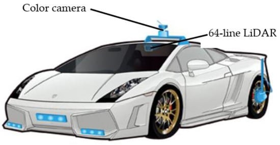 The LiDAR is a Velodyne (Velodyne LiDAR, San Jose, CA, USA) 64-line three-dimensional radar system which can send a detection signal (laser beam) to a target, and then compare the received signal reflected from the target (the echo of the target) with the transmitted signal. After proper processing, the relevant information of the target can be obtained. The LiDAR is installed at the top center of a vehicle and capable of detecting environmental information through high-speed rotation scanning []. The LiDAR can emit 64 laser beams at the head. These laser beams are divided into four groups and each group has 16 laser emitters []. The head rotation angle is 360° and the detectable distance is 120 m []. The 64-line LiDAR has 64 fixed laser transmitters. Through a fixed pitch angle, it can get surrounding environmental information for each  and output a series of three-dimensional coordinate points. Then, the 64 points  acquired by the transmitter are marked, and the distance from each point in the scene to the LiDAR is used as the pixel value to obtain a depth image. The color camera is installed under the top LiDAR. The position of the camera is adjusted according to the axis of the transverse and longitudinal center of the camera image and the transverse and longitudinal orthogonal plane formed with the laser projector, so that the camcorder angle and the yaw angle are approximated to 0, and the pitch angle is approximately to 0. Color images can be obtained directly from color cameras, but images output from LiDAR and camera must be matched in time and space to realize the information synchronization of the two.