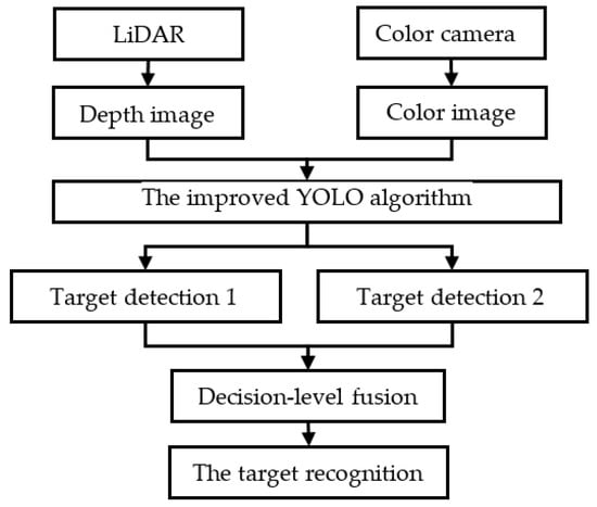 The target detection process based on sensor fusion is shown in Figure 2. After collecting information from the traffic scene, the LiDAR and the color camera output the depth image and the color image, respectively, and input them into the improved YOLO algorithm (the algorithm has been trained by many images collected by LiDAR and color camera) to construct target detection Models 1 and 2. Then, the decision-level fusion is performed to obtain the final target recognition model, which realizes the multi-sensor information fusion.