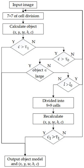 - When the distance l between the target marked as {others} and the autonomous vehicle is less than the safety distance l0 (the distance that does not affect decision making; if the distance exceeds it, the target can be ignored), i.e., , the slider region divided as {other} is marked, and the region is subdivided into 9 × 9 cells. The secondary convolution operation is performed again. When the confidence score c of the secondary detection is higher than the threshold , the border model of {others} is output, and the category is changed from {others} to {non-motor vehicle} or {pedestrian}. When the confidence score c of the secondary detection is lower than the threshold , it is determined that the target does not belong to the classification item, and the target is eliminated.