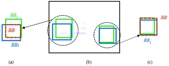 Decision-level fusion diagram of detection model. Blue area (BB1) is the model output from the depth image. Green area (BB2) is the model output from the color image. Red area (BB’) is the final detection model. When r12 = 0, the fusion process is shown in (a). The models not to be fused are shown in (b). When r12 = 1, the fusion process is shown in (c).