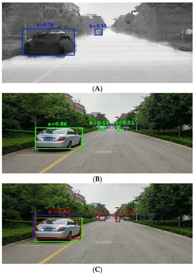 - For target a, according to the decision-level fusion scheme, the result is obtained; then, the overlapping area is taken as the final detection model, and the confidence score after fusion is 0.82, as shown in Figure 6C (a’).