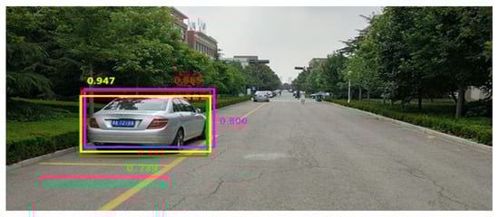 Figure 8 shows the vehicle identification with the training steps of 4000, 6000, 10,000, and 20,000. The yellow dotted box indicates the recognition rate when the learning rate is 10,000. Clearly, the model box basically covers the entire goal and almost no redundant area. Based on the above analysis, the number of steps set in this paper is 10,000.