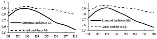 Table 3 shows the estimated confidence scores and final scores of the output detection models BB1 and BB2 under different learning rates. Figure 9 shows the change trend of the confidence score. After analyzing Table 3 and Figure 9, we can see that, with the decrease of learning rate, all of the confidence prediction score and actual score of model experienced a rising trend firstly and then decreasing. When the learning rate reaches D3 (10−2), the confidence score reaches a maximum value, and the confidence level remains within a stable range with the change of learning rate. Based on the above analysis, when the learning rate is 10−2, the proposed model can obtain a more accurate recognition rate.