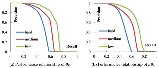 In the formula, TP, FP, and FN indicate the correctly defined examples, wrongly defined examples and wrongly negative examples, respectively. The Precision–Recall diagram for each model BBi (i = 1, 2) is calculated, as shown in Figure 11a,b.