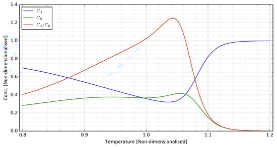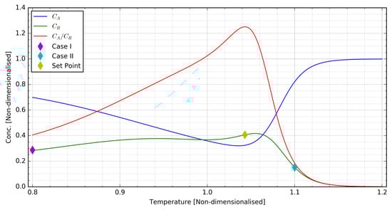 Figure 1 shows that, at steady-state conditions for a given q, reaches a maximum at a certain temperature, beyond which the reaction gets driven back to the left of Equation (1) to eventually yield only A and no R. This system possesses rich and relevant dynamics for continuous pharmaceutical manufacturing and is therefore worth detailed investigation.