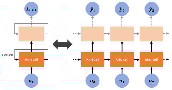 The regressors required to predict are henceforth represented by , and they are introduced into the RNN in a fashion illustrated in Figure 4. Equation (9) below serves as a shorthand to describe the RNN: