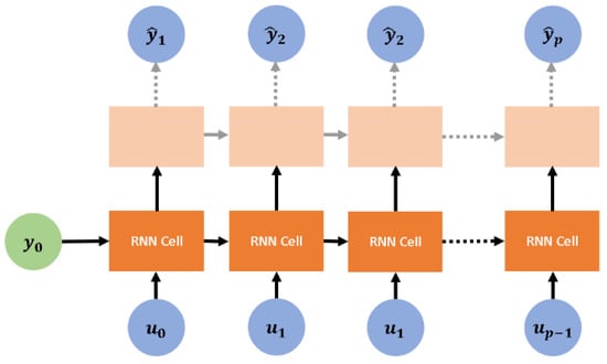 ANNs serve as a potential source of models that capture the dynamics of highly non-linear systems sufficiently well while being relatively easy to obtain and evaluate online, and RNNs are a sub-class of ANNs that are structured to better capture temporal dependencies in the system. RNNs are particularly useful for making p-step ahead predictions of state variables for predictive control, because the prediction for time-step p depends on the present state and all control actions in time-step . The prediction for time-step used in the above prediction for time-step p depends similarly on the present state and all control actions in time-step , and so on.