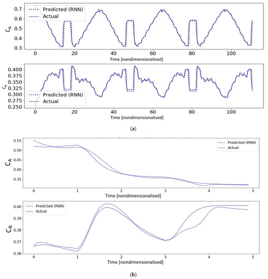 Figure 6a reveals a good fit of the RNN to the training data, and testifies to the model’s ability to reflect highly dynamic outputs from highly dynamic training data. Figure 6b shows that the model succeeded in capturing the general trends for previously unseen test data. Even though this fit was not perfect, particularly for between 3 and 4 time units, it will be demonstrated in a later section that satisfactory closed-loop performance can still be achieved with predictions from this RNN.