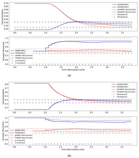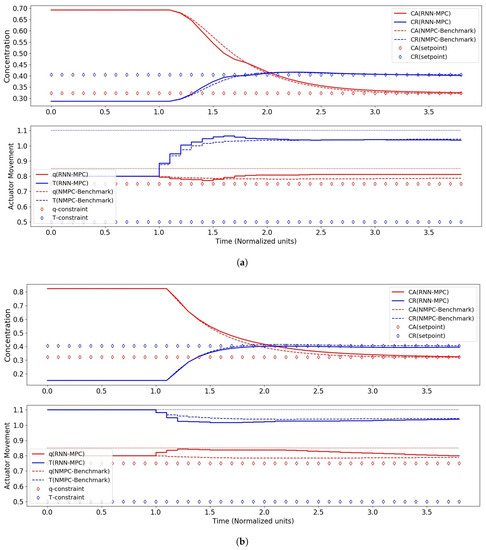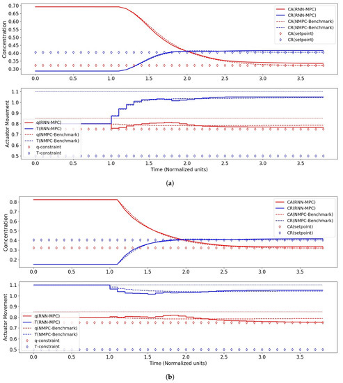 In what follows, the closed-loop control performance of the RNN-MPC controller will be benchmarked against the NMPC controller whose internal model is the actual full plant model as described in Equations (2)–(4). This NMPC controller was implemented using the same software as that of the RNN-MPC controller, whose implementation was described in Section 3.2.