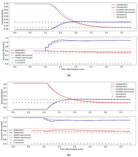 Control performance of RNN-MPC with 500 hidden nodes and two RNN layers. (a) Control performance for case I (start-up). (b) Control performance for case II (upset-recovery).