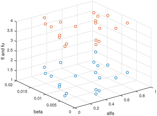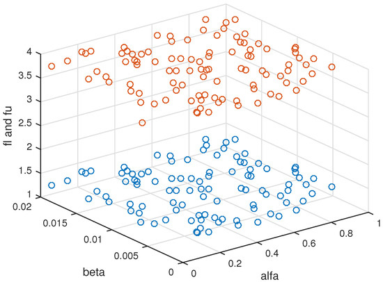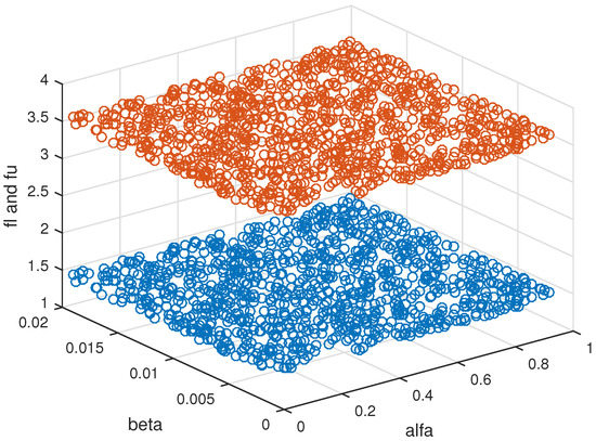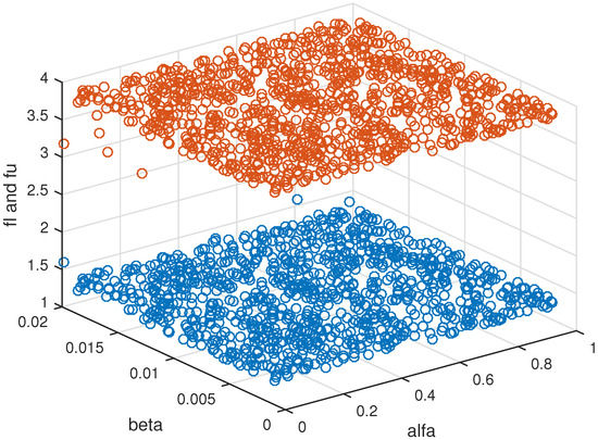 We present computational results on Examples 1 and 2 to compare the results due to Theorems 2 and 3. To compare the obtained results for the numerical examples, we use different diagrams and tables to show the advantages of the given Theorems 2 and 3 by showing that any solution of the problem or is an efficient solution of the problem . In addition, the efficient space for different pairs of is also shown, with the generated nonzero elements taken randomly in the interval and elements of vector given in with step length 1.