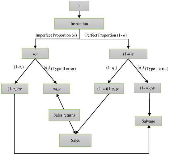 At the beginning of the cycle, the inspection and sale of perfect items start simultaneously at the whole seller’s side. However, due to some errors committed by the inspector, there is the occurrence of Type-I and Type-II errors, with their respective proportions being q1 = Pr(items screened as defects | non-defective items) and q2 = Pr(items not screened as defects | defective items)(0 < q1 < q2 < 1), following the probability density function of f(q1) and f(q2), respectively. It is assumed that (q1) and (q2) are independent of defect proportions (α). All of the items involving inspection errors are estimated inter-dependently by (q1), (q2), and (y). The flow of events is illustrated in Figure 3.